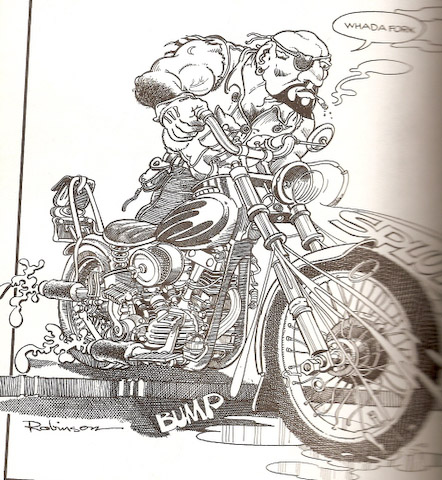 Detail a skrytý humor z důrazem na chytrý a vtipný tah pera. To je Hal Robinson, mistr perokresby a karikatury, který byl pověstný svou výtvarnou pečlivostí každého svého díla. Pracoval pro takové časopisy jako Easyrider a Iron Horse. V Easyrider se proslavil komiksem „Zázračný Mutha“ a „Red Rider“. Hodně se věnoval vtipným karikaturám motorkářů a jejich životnímu stylu a ilustroval řadu značek motocyklů. Byl i velmi chytrým politickým karikaturistou. Mnoho karikaturistů se snažilo kopírovat jeho styl. Je autorem děl „Seal Beach“ a „Avalon“ z počátku 70 let